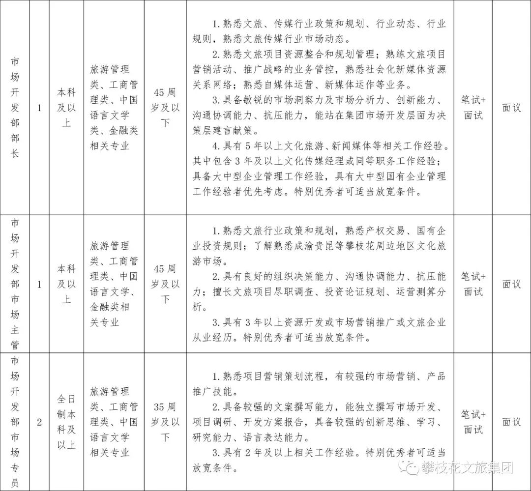 根據(jù)攀枝花文旅集團有限公司(以下簡稱“文旅集團”或“集團”)發(fā)展需要,為進(jìn)一步充實人才隊伍力量,現(xiàn)面向社會公開滾動招聘相關(guān)專業(yè)人員10名。現(xiàn)將有關(guān)事項公告如下: