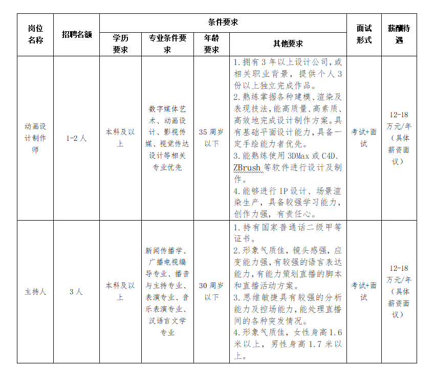 本次公開招聘擬招聘攀枝花文旅集團(tuán)市場運(yùn)營部動畫設(shè)計制作師1-2名、主持人3名。具體條件見下: